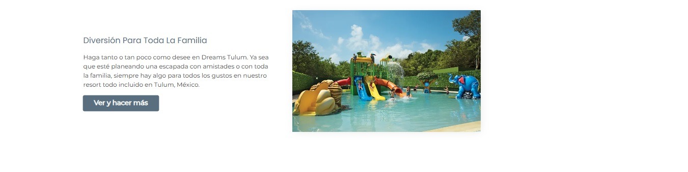 Disfrute de una escapada de lujo en Dreams® Resorts & Spa con una fascinante vista al mar, servicio de habitaciones gourmet y actividades para todas las edades, intereses o pasiones. Las espaciosas habitaciones y suites, perfectamente decoradas y lujosamente equipadas, ofrecen una experiencia vacacional perfecta, junto con un servicio acogedor y románticas opciones incluidas. Dreams Tulum es un paraíso tropical con una ubicación ideal cerca de las antiguas atracciones mayas más famosas. Disfrute de la deslumbrante vista a la playa y a la piscina, opciones de comidas gourmet y bares, infinitas actividades de día o de noche y celebraciones románticas. Lo único que tendrá que hacer es relajarse y disfrutar de la fresca brisa del mar.